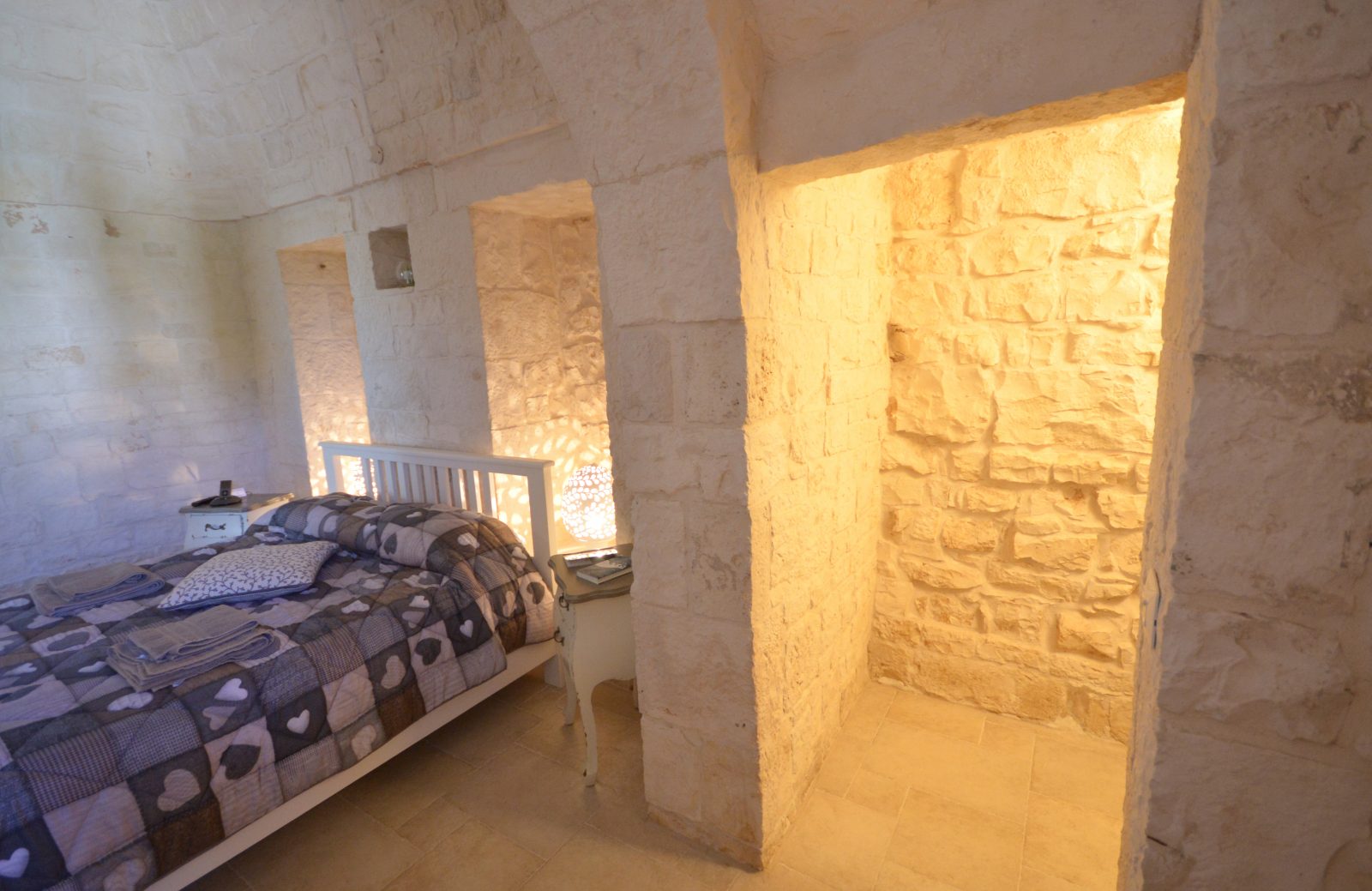 Grande e spaziosa, idelae per 2 persone. Era la camera patronale del trullo, ed è composta da una cabina armadio, un letto matrimoniale, e la possibilità di aggiungere un lettino. Bagno ovviamente in camera con doccia relax molto spaziosa. Dotata di ogni confort, dai riscaldamenti a pavimento, aria condizionata, tv ecc…